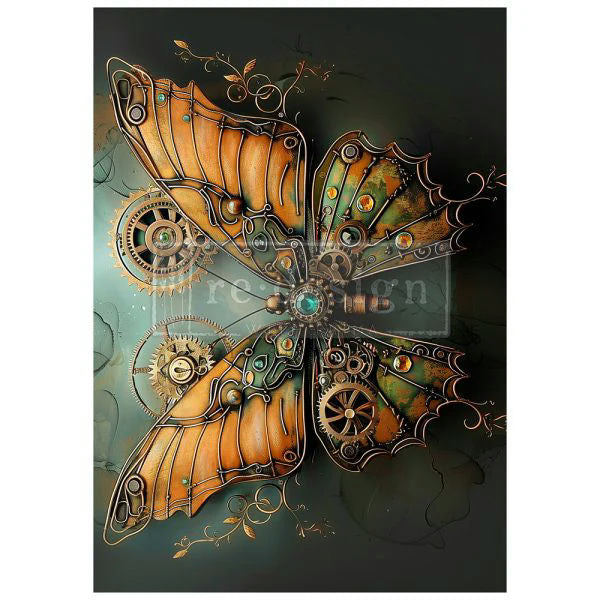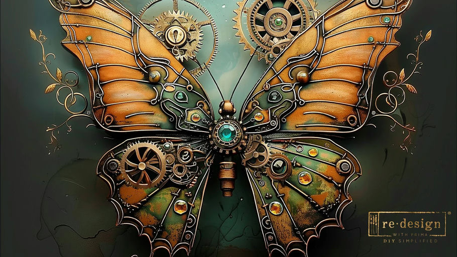 Experience the magic of transformation with "Gadget Wing” Decoupage Fiber Paper by Redesign with Prima® This unique decoupage fiber features a butterfly exquisitely crafted with steampunk gears and vibrant jewels. Ideal for dreamers and innovators, this piece brings a touch of whimsical elegance and industrial charm to any room, turning your furniture into a work of art. Our A1 Decoupage Fiber Paper is incredibly easy to use. Simply measure and cut the desired amount of paper, add Decoupage Gel on the prepared surface, set paper on top and smooth it with the Scraper Tool or Brayer. Our Fiber Paper is created for use on walls, furniture, and other décor items