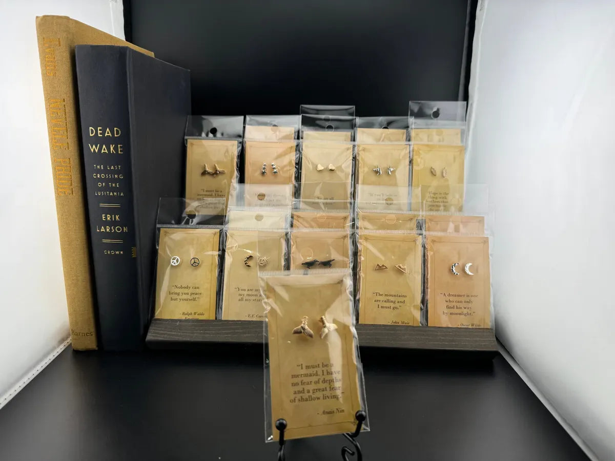 Looking for the perfect gift for the bookworm in your life? Look no further! Literary themed earrings make a fun, unique present for all the lit nerds out there. Great stocking stuffer or even gift tag idea! Several designs available. Golden mermaid tail post earrings. Quote reads, "I must be a mermaid. I have no fear of depths and a great fear of shallow living." - Anais Nin