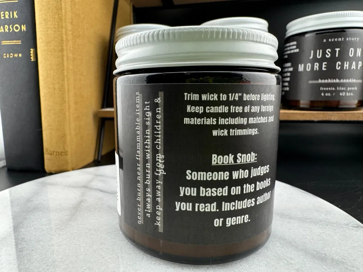 Looking for the perfect gift for the bookworm in your life? Look no further! Literary themed candles make a fun, unique present for all the lit nerds out there. Small enough to make a great stocking stuffer! Several scents available. Check out our "Buy It Now!" (Literature, literary, book nerd, dark academia, gifts for readers, Bookish) Books Snob features scents of eucalyptus, spearmint and vanilla. 4oz candle with an estimated 40 hour burn time.