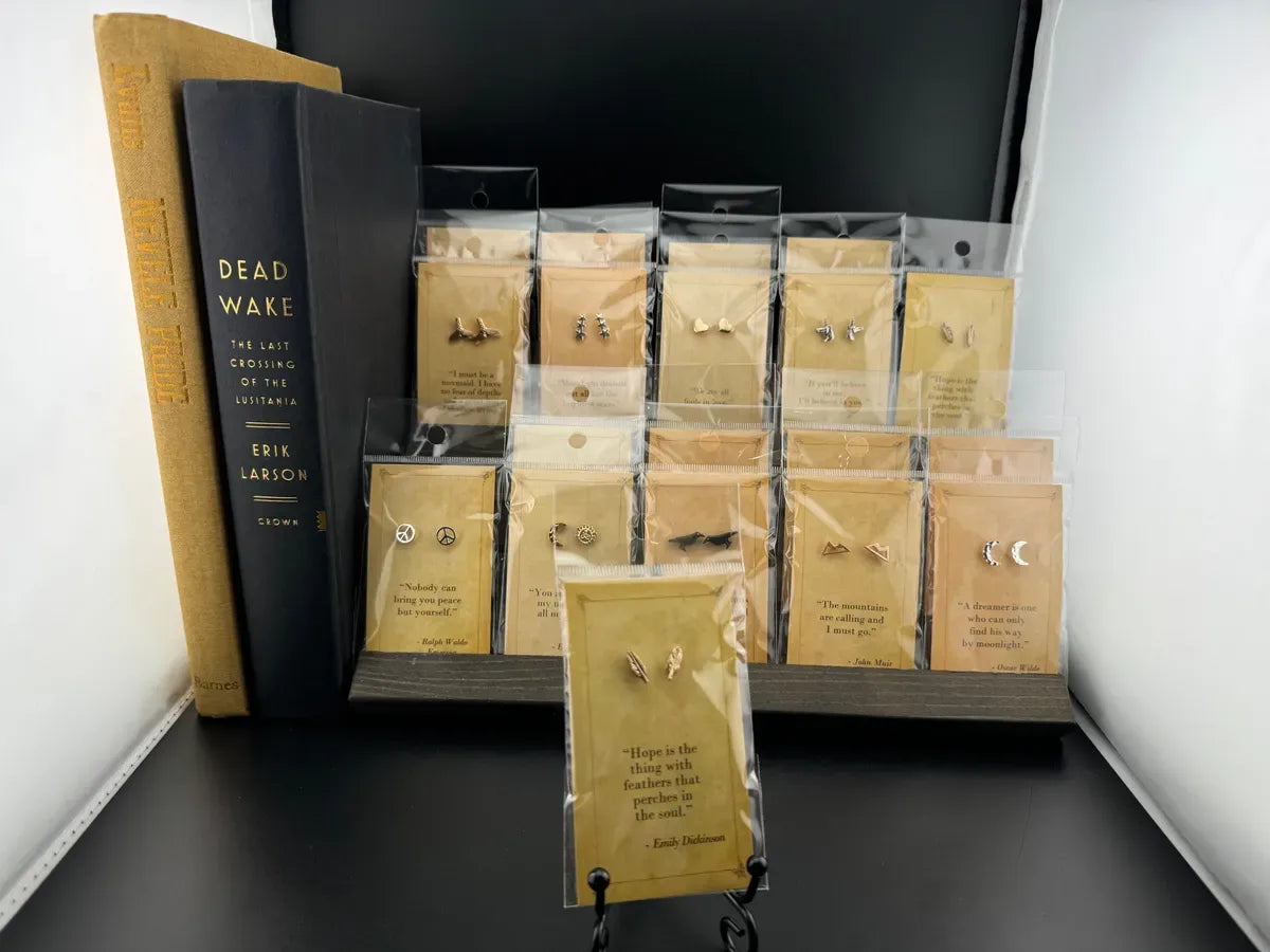 Looking for the perfect gift for the bookworm in your life? Look no further! Literary themed earrings make a fun, unique present for all the lit nerds out there. Great stocking stuffer or even gift tag idea! Several designs available. Golden feather post earrings. Quote reads, "Hope is the thing with feathers that perches in the soul." - Emily Dickinson