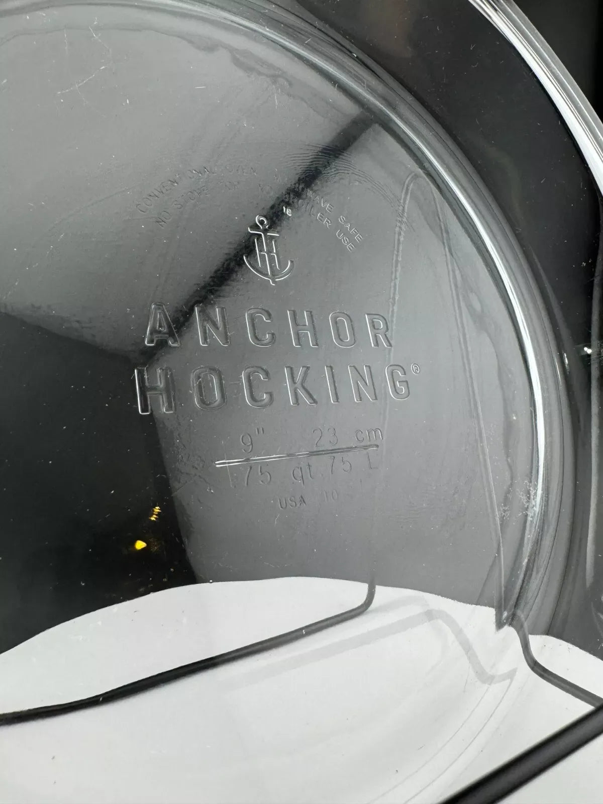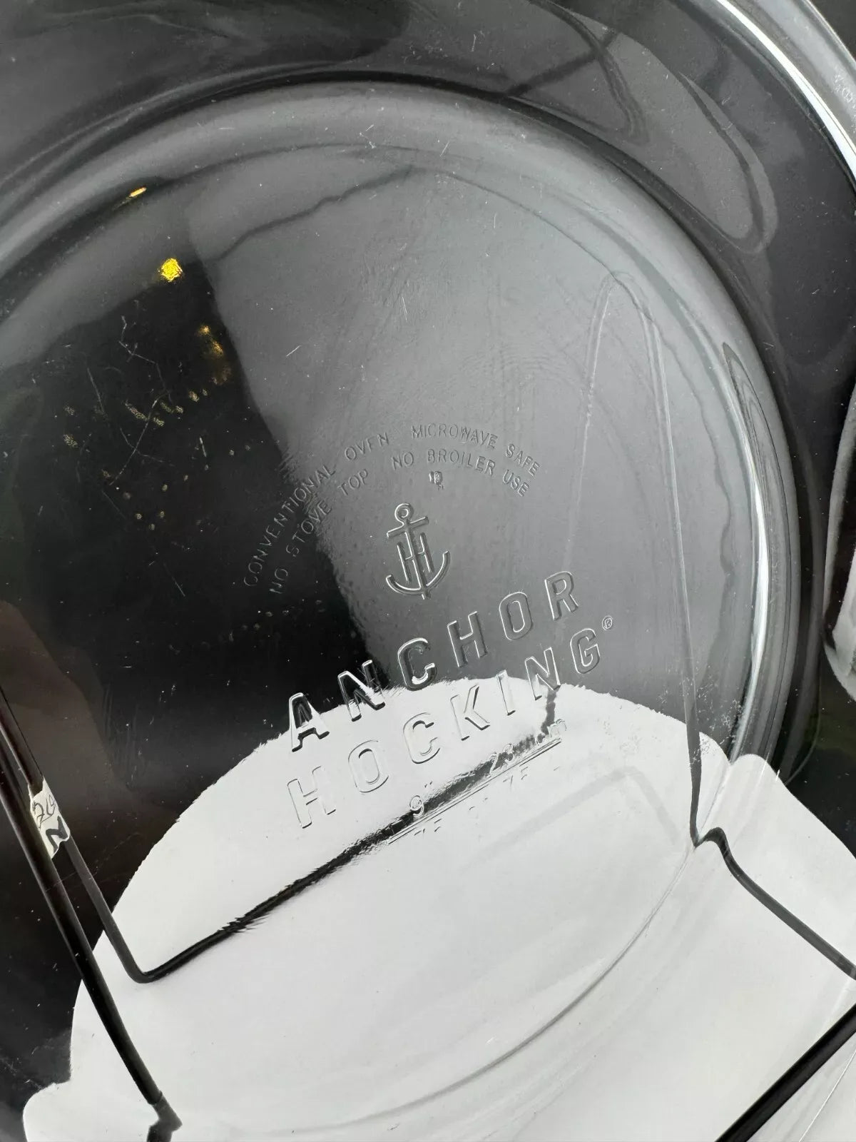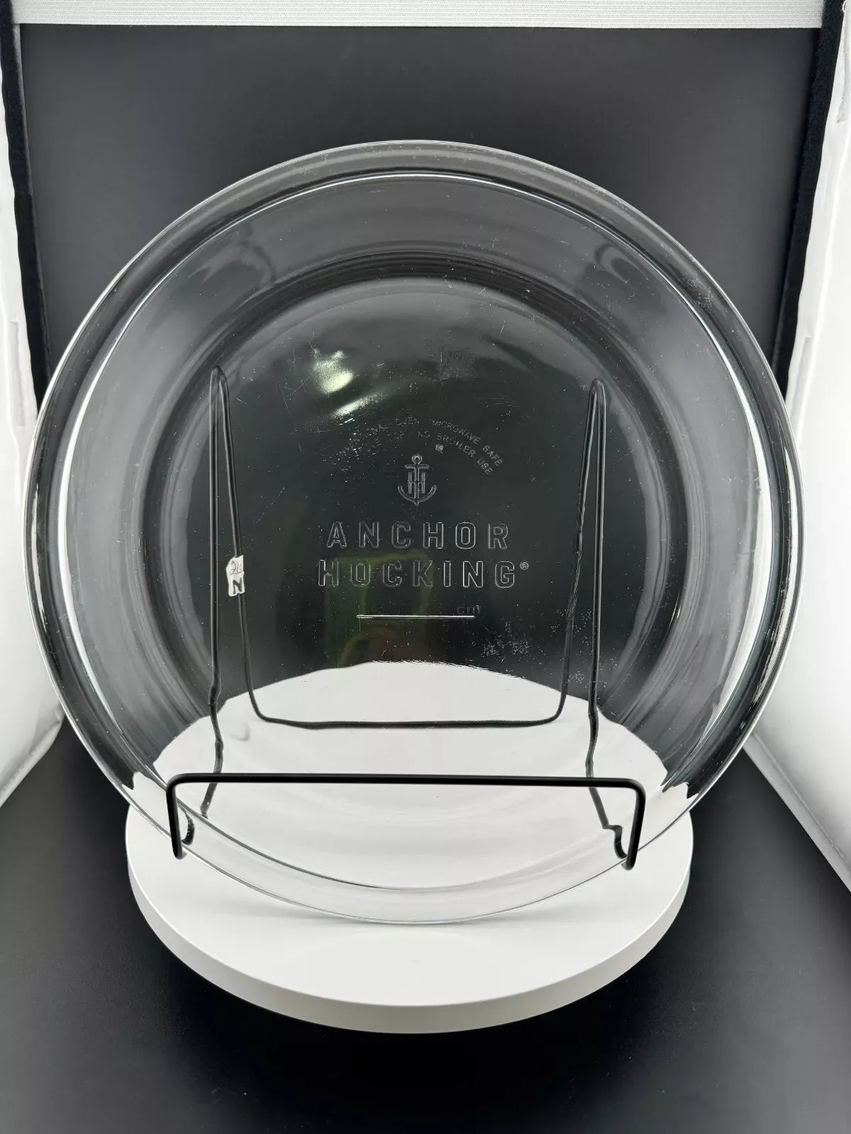 Simple, scalloped edge, clear glass pie plate with handles by Anchor Hocking. Conventional oven & microwave safe. No stove top or broiler use. 9"/23cm. 1qt/1L.