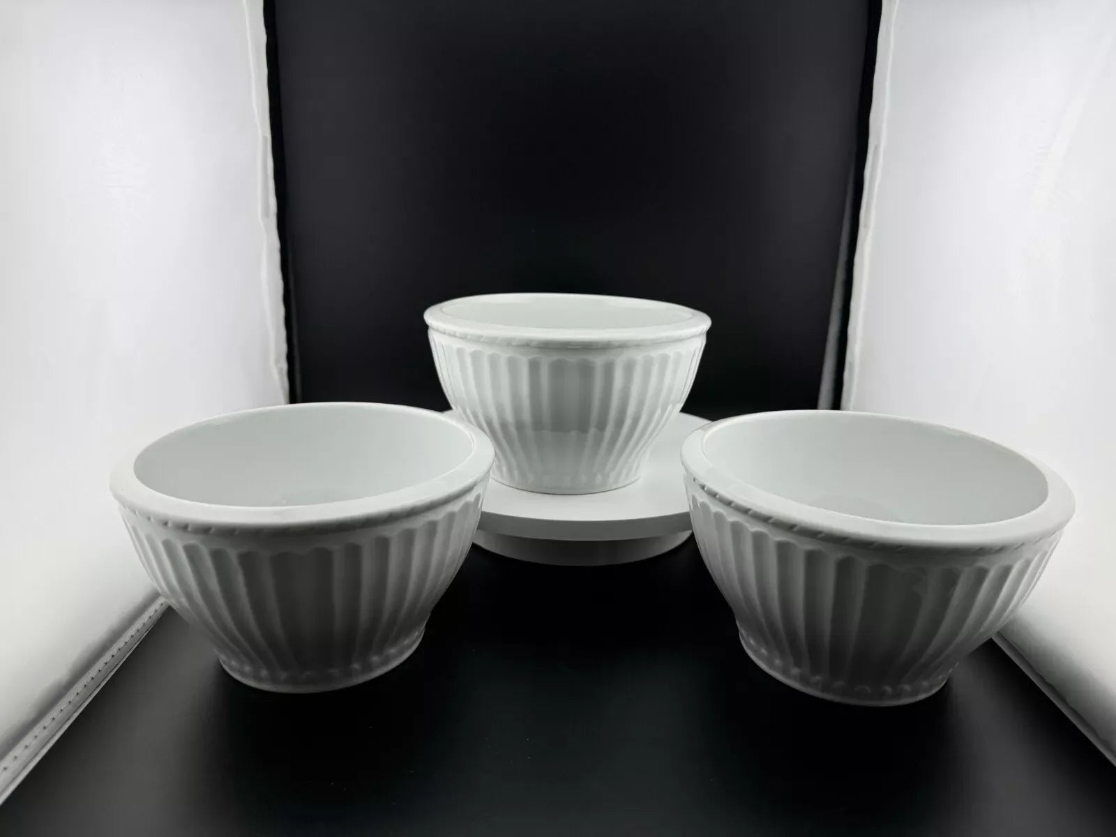 Three virtually pristine bowls available (sold individually). I couldn't find any cracks, chips or blemishes. Coventry's "Parthenon" pattern is a lovely natural white porcelain with a rope pattern along the upper rim, fluted sides (like Greek columns) and a tree pattern along the bottom rim. Elegant, simple and timeless pattern! Dishwasher and microwave safe. 3.25" tall, 5.75" diameter to outer edge and just shy of 5" inner diameter. These are heavy, substantial pieces!
