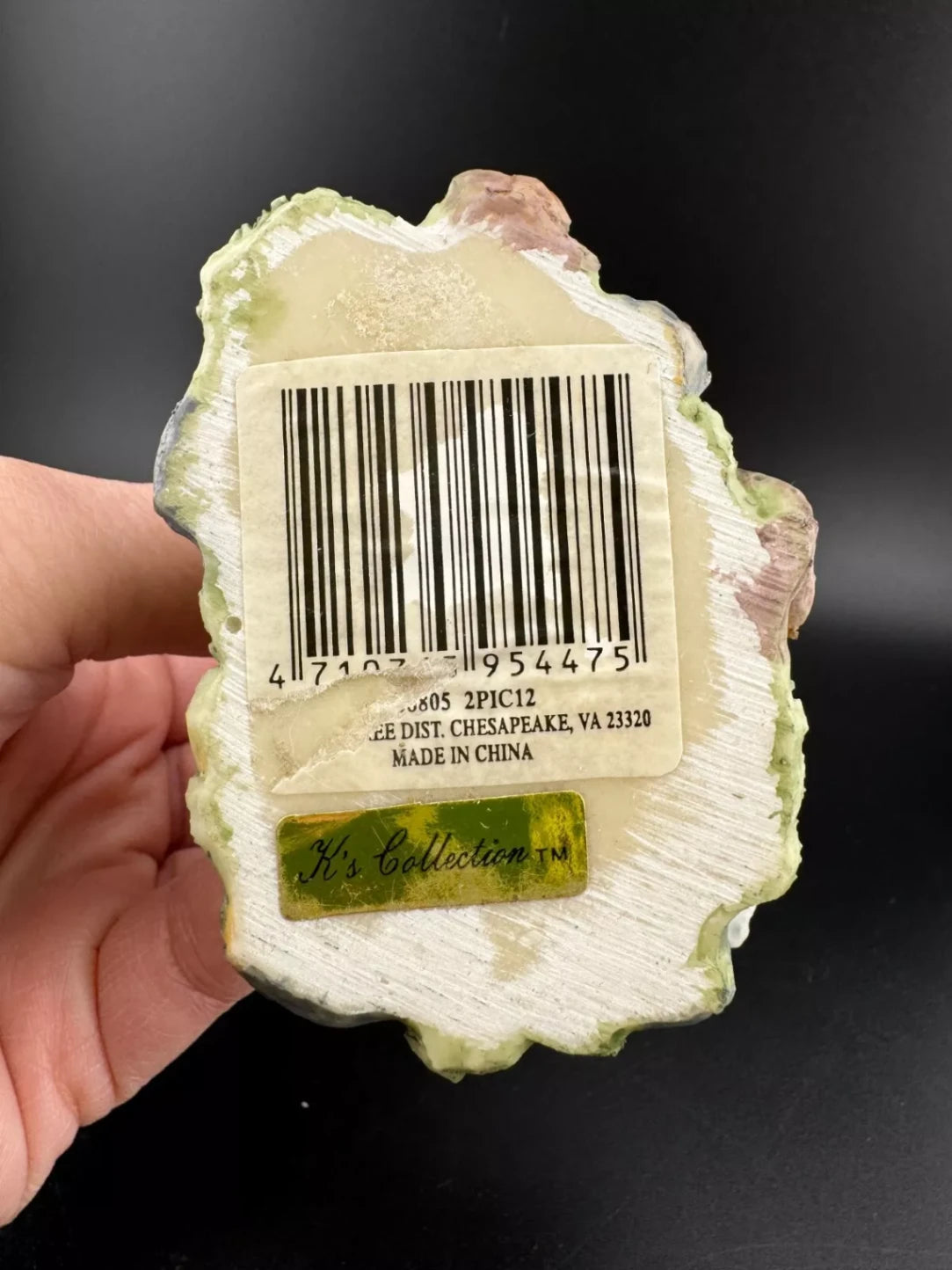 Hummingbird perched over blue hibiscus flowers. 5" tall, 4" wide, 3.5" deep.