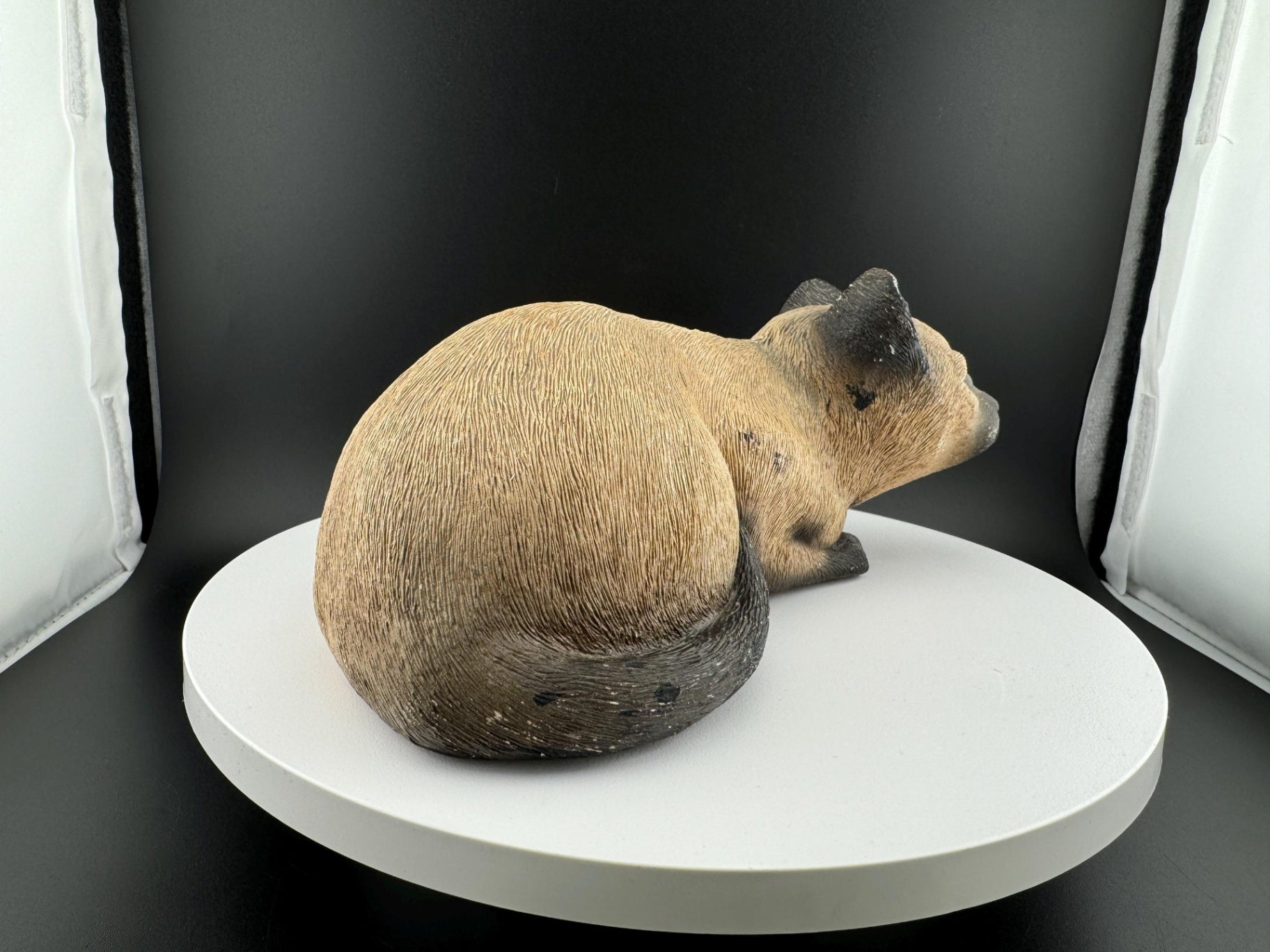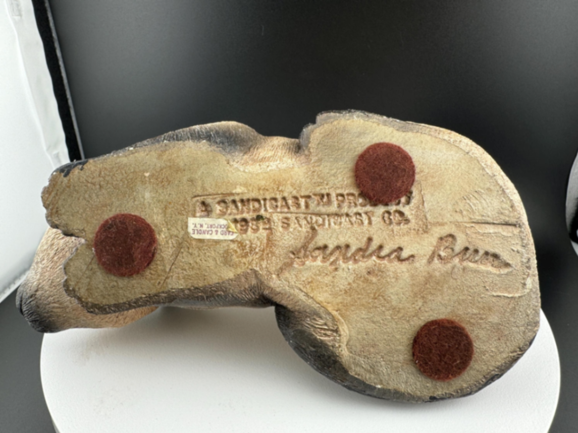 Sandicast crouching Siamese cat with blue eyes by Sandra Brue, 1982. Good overall condition with some wear on the paint (common in these pieces based on research). No major flaws, ships or cracks. Adorable piece for any Siamese kitty lover!